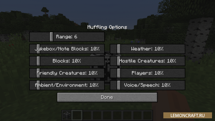 Мод Better Muffling добавляет специальный блок, который позволяет отключить или приглушить звуки, которые вам уже порядком надоели. В моде присутствует специальная панель настройки, где вы можете приглушить те звуки, которые вам мешают. Например вы можете приглушить звуки издаваемые мобами, или открыванием двери, или музыки и многие другие.