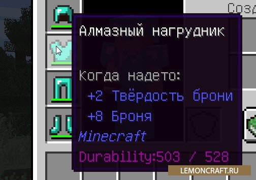 Мод Giselbaer’s Durability Viewer добавляет в верхний правый угол информацию о прочности вещей, который на вас надеты. Данная информация покажет вам какой у вас запас ударов кирки, какая прочность брони, сколько у вас свободных слотов в инвентаре. В зависимости от того в каком состоянии находится определенный показатель, он окрашивается в зеленый, желтый и красный цвета, что соответствует запасу прочности. Так же есть звуковое сопровождение о том, что вещь уже совсем негодная.