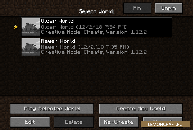 Мод на избранные миры Cherished Worlds дает вам возможность помечать звездочкой те миры, которые вам особо нравятся. Для того, что бы закрепить мир (пометить его), нужно нажать кнопку, которая появится сверху меню. Вы можете закрепить сколько угодно миров и их сортировка будет происходить так же, как и незакрепленных миров. После установки этого мода вы можете пометить карту, к которой бы хотели вернуться позже и искать ее вам долго не придется.