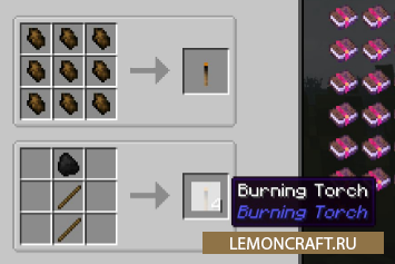 Мод на гаснущие факелы Burning Torches добавит в игру больше реализма факелами, которые будут иметь конечное время горения. Данные факелы не будут гореть постоянно, как ванильные, они будут гаснуть через 15 минут горения. Кроме этого, если пойдет дождь он так же потушит факел. Теперь вам придется постоянно следить за ними и заготавливать их в большом количестве. В настройках файла можно изменить время горения факела. Ванильные факелы остаются в игре, они будут генерироваться по миру, но скрафтить их будет нельзя.