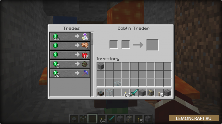Мод на гоблинов торговцев Goblin Traders добавляет в игру нового моба с которым вы сможете вести торговлю. Найти гоблина торговца вы сможете только в давно заброшенных подземельях. У данного моба можно приобрести уникальные вещи, которые вы сами никогда бы не смогли найти. Например, вы сможете приобрести книги, с помощью которых сможете зачаровывать предметы на более высокие уровни, чем стандартное зачарование.