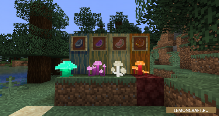 Мод на грибы с эффектами Wild Mushrooms добавит в игру несколько видов новых грибов, имеющих яркий окрас, а найти из вы сможете в нижнем мире, на болотах и в джунглях. Если совместить данные виды грибов с арбузом, вы сможете получить различные эффекты: ночное зрение, силу, тошноту, медлительность, свечение и сопротивление.