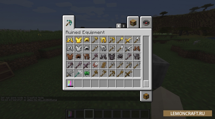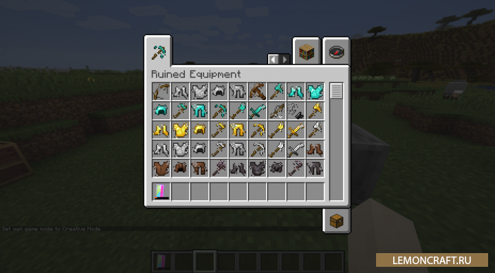 Мод на сломанные предметы Ruined Equipment делает предметы имеющие нулевую прочность разрушенными или дает вам возможность отремонтировать их. Так же вы сможете увековечить данные предметы любым удобным вам способом.