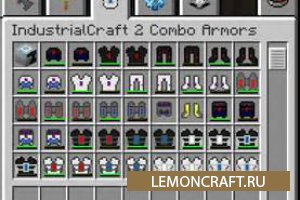 Мод на комбинированную броню Combo Armors является аддоном для мода Industrial Craft 2 и добавляет в игру новые виды брони, новые инструменты, а так же полезные механизмы. Установив данный мод вы сможете использовать нановолоконную броню с реактивными ранцами, а так же квантовую кирасу. К новой броне вы сможете приспособить 3 вида реактивных ранца: аккумуляторные, лазуротроновый, электрический. Так же получать улучшения такие инструменты, как нано-лук, дрель и полетная турбина.