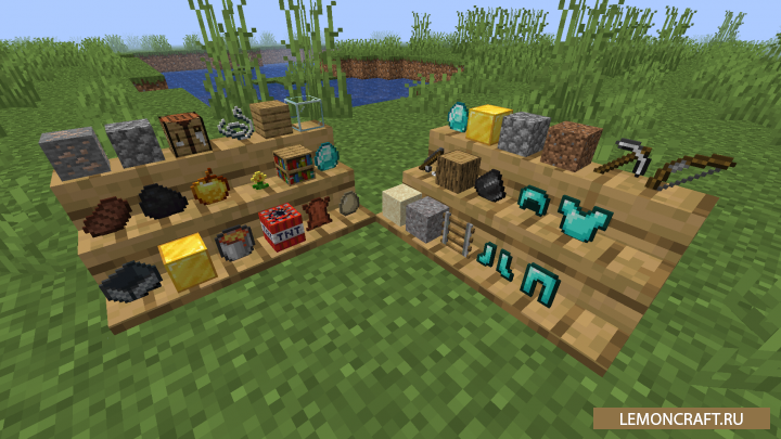 Мод на декоративную полку Shelf добавляет в игру ничем непримечательную полку, на которой вы сможете складывать различные предметы. На каждой полке вы сможете хранить до 9 предметов и блоков. Очень удобная штука, позволит навести порядок в мире майнкрафт.
