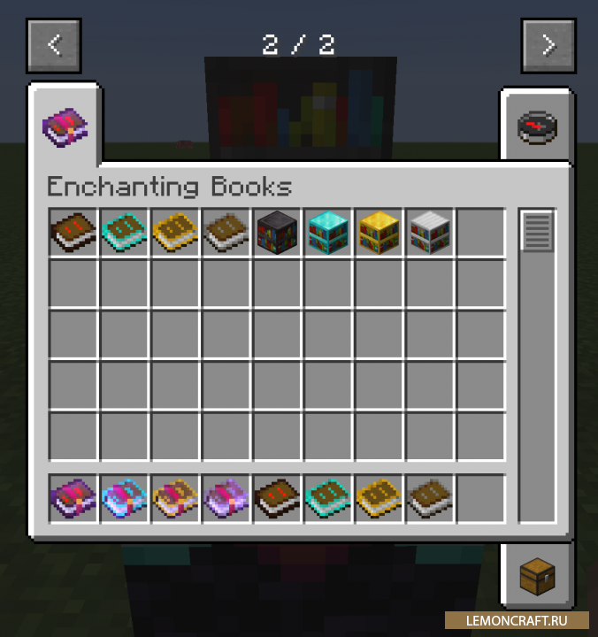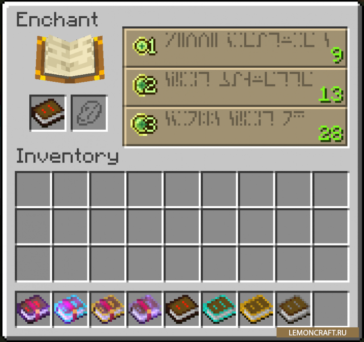 Мод на продвинутые книги Enchanting Books добавит в игру усовершенствованные книги, а так же полку для этих книг. В игре появятся железные, золотые, алмазные и незеритовые книги, стоимость которых превышает стоимость обычных книг, но при этом увеличивает шанс получить более сильные виды зачарований , при этом используется меньшее количество полок.