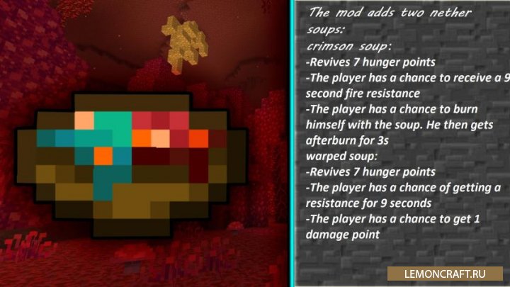 Мод на супы пустоты Nether Soups добавит в игру два вида новых супов, которые ориентированы на нижний мир. Приготовить данные супы можно с использованием багровых и искаженных грибов. Данные супы утолят ваш голод, наделят вас полезными эффектами, а так же могут нанести урон противнику или поджечь его.