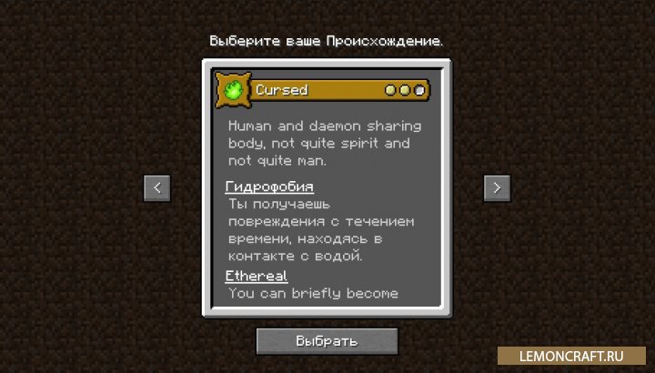 Мод на демона Daemonic небольшой аддон для мода Origins, добавляющий в игру два демонических происхождения вашего героя. В первом случае будет хорошая регенерация и эфирная сила, но на солнце получаемый урон больше; во втором, увеличенная скорость атаки и передвижения, но только половина здоровья. И в каждом случае вода будет наносить урон, а от железа игрок начнет гореть.