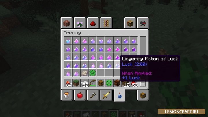 Мод на жидкую удачу Liquid Luck добавит в игру возможность самому варить зелье удачи. Такое зелье уже есть в игре майнкрафт, но до этого мода на него не было рецепта. Для создания такого зелья вам понадобится четырехлистный клевер , который вы сможете найти на месте разрушения блока травы. Кроме этого вы можете сварить зелье неудачи, для чего вам нужно испортить зелье удачи маринованным паучьим глазом.