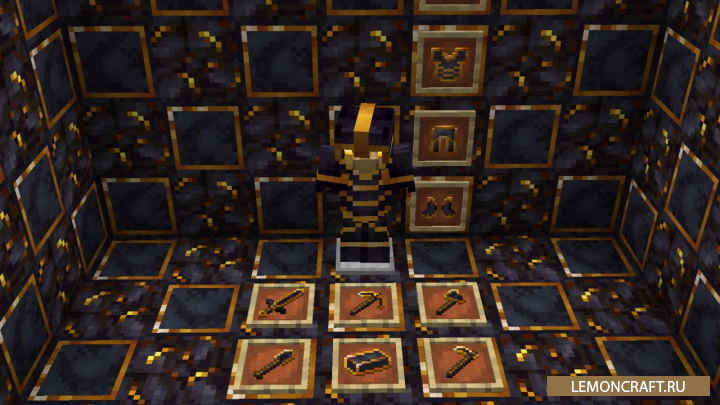 Мод на превосходное оружие и инструменты Gilded Ingot дает вам возможность переплавки чернокамня, в результате чего вы сможете создавать уникальные инструменты, оружие и броню. Созданные предметы будут иметь намного лучшие характеристики, чем у железных вариантов. Так же вы сможете крафтить несколько декоративных блоков.