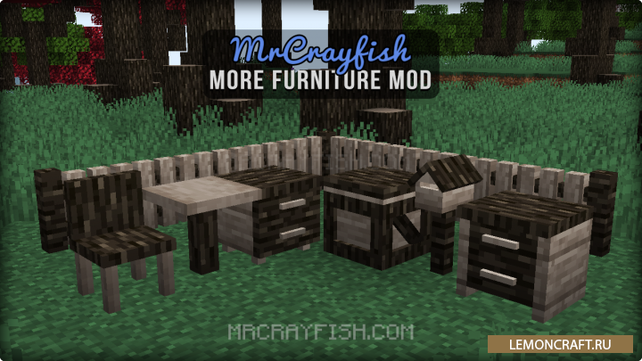 Мод на мебель MrCrayfish's More Furniture является аддоном для мода MrCrayfish’s Furniture и добавляет в игру просто огромное количество блоков мебели из древесины, которая используется в таких модификациях, как Atmospheric, Autumnity, Biomes O Plenty, Environmental, Oh The Biomes You'll Go. Отдельно данный мод ничего не добавляет, только в сочетании с этими модификациями.