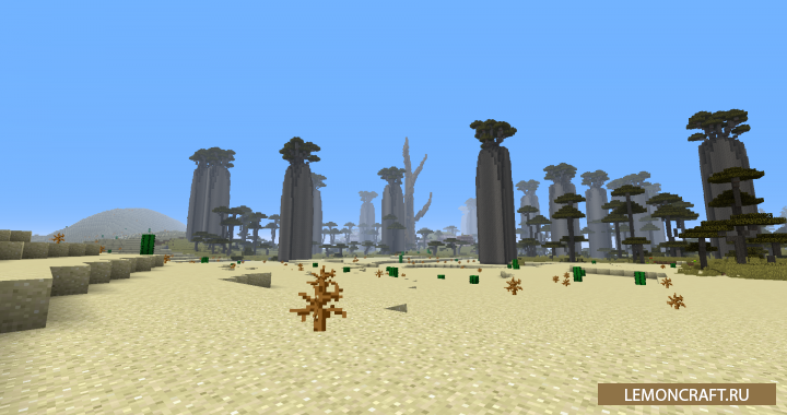 Мод на большие деревья Tan's Huge Trees добавляет в игру новые структуры, в составе которых присутствуют просто огромные деревья. За счет своих больших форм эти деревья значительно изменят ощущения от внутри игровых биомов и наполнят их новыми красками.