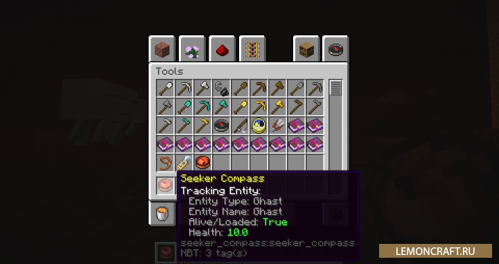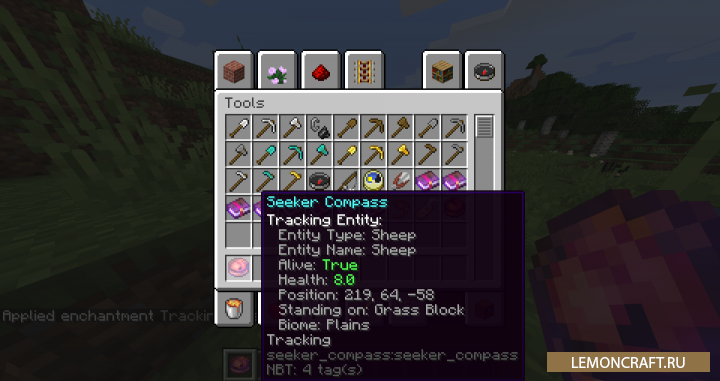 Мод на компас искателя Seeker Compass добавит в игру новый компас, с помощью которого вы сможете отслеживать выбранное вами существо. Так же вы сможете зачаровать этот компас, что добавит ему дополнительные функции: телепортация к игроку или наоборот, нанесение урона, точные данные местонахождения и защита от исчезновения (деспавна).