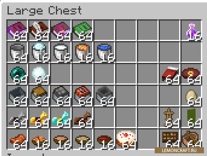 Мод на увеличенный размер стаков Lenient Stack Size повысит размер стаков для тех вещей, которые занимают очень много места в инвентаре. К таким вещам относятся лодки, книги, ведра, вагонетки и другие предметы занимающие много места. Одни из предметов вы сможете компоновать в стеки по 16, а другие по 64 элемента на стек.