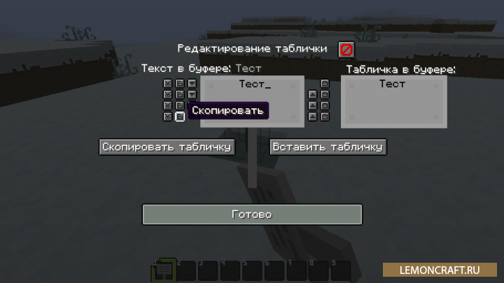 Мод на инструменты для создания табличек Sign Tools отлично подойдет для тех, кто постоянно нуждается в создании различных табличек с похожим текстом. В игре появится интерфейс, который даст вам возможность сохранять текст таблички в буфер обмена и переносить данный текст на следующую табличку.