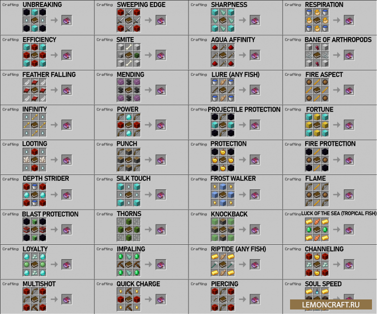Мод на крафт книг с зачарованиями Craftable Enchants позволит вам создавать книги с зачарованиями, содержащими рецепты с довольно приемлемыми ценами. Учитывайте, что при создании такой книги в ней будут доступен только максимальный уровень для зачарований.