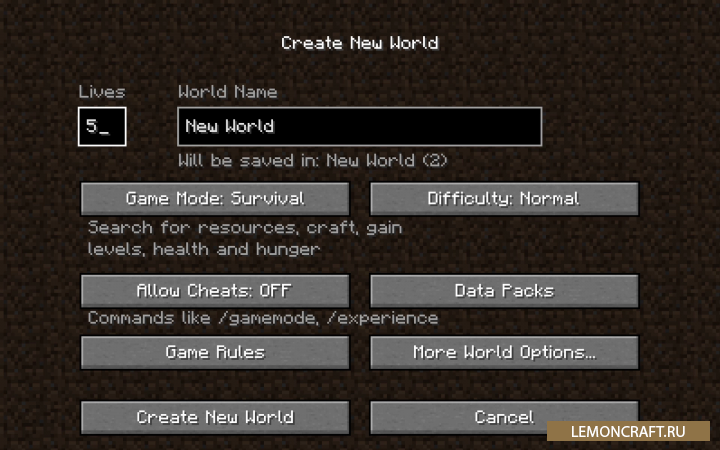 Мод на регулировку возрождений World Lives Mod добавляет в игру возможность регулировать количество возрождений в процессе создания мира. После установки мода, с каждой смертью игрока, счетчик жизней снижается на единицу. Как только данный счетчик достигнет 0 игрок возродится в качестве наблюдателя, а не участника.