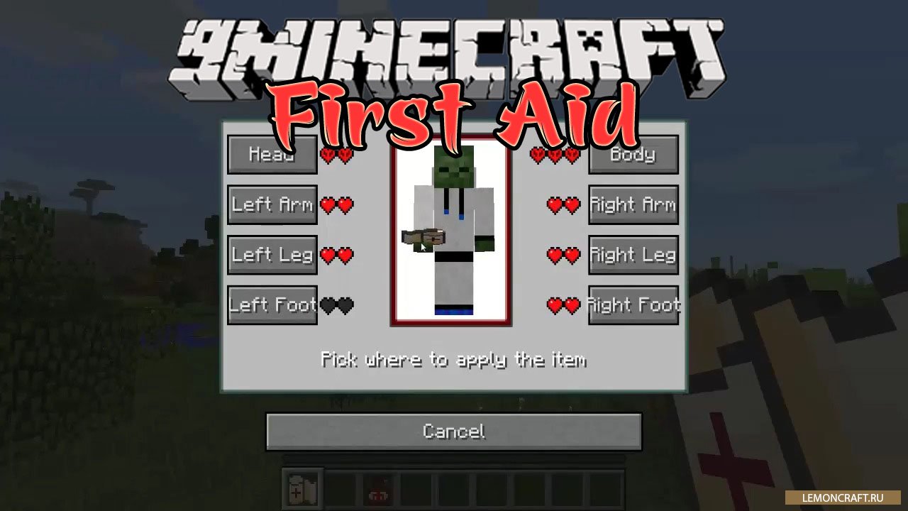 Задача мода First Aid изменить механику восстановления здоровья. Теперь, когда вам наносят повреждения вы получаете урон для тела, головы, рук и ног по отдельности. Каждая часть тела имеет свой запас здоровья.